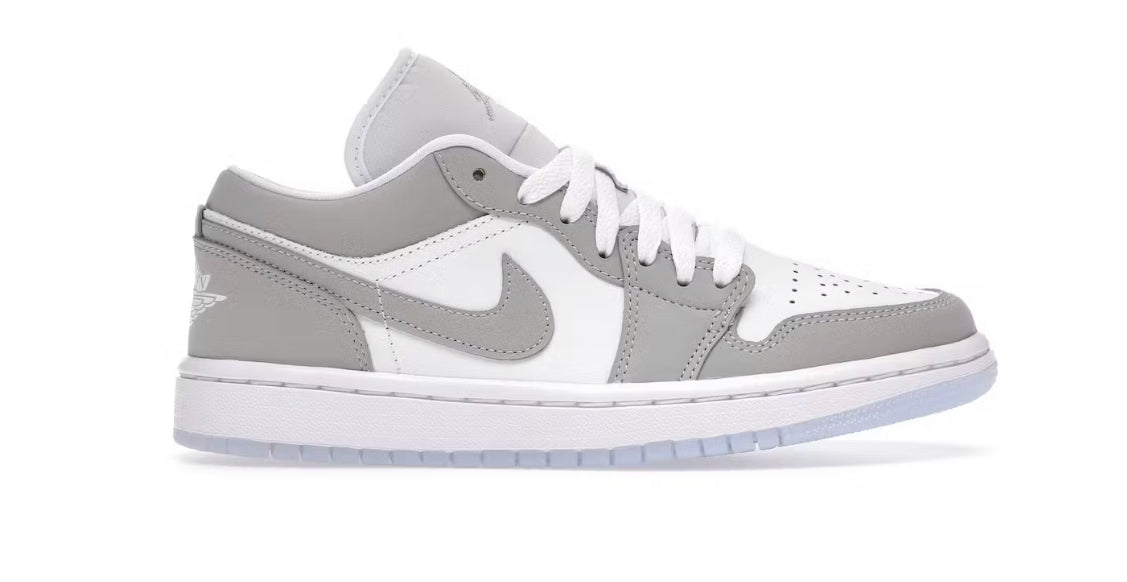 The women's Jordan 1 Low Wolf Grey (W) features a white leather upper with Wolf Grey Durabuck overlays and Swooshes. From there, a Jordan Wings logo on the heel and a translucent outsole adds the finishing touch.
