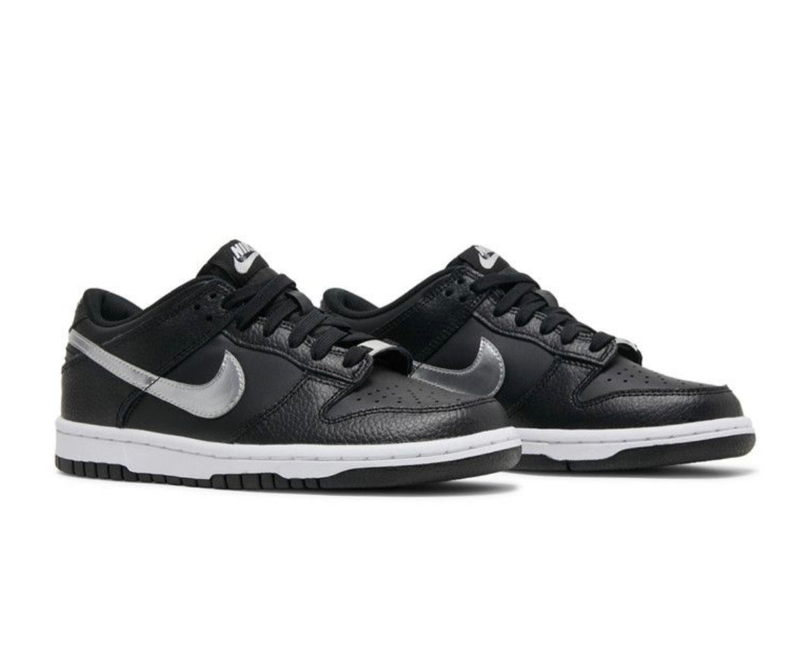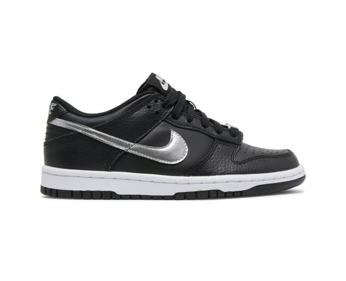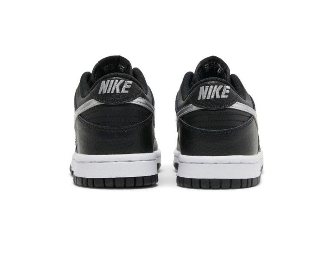 Nike Dunk Low NBA 75th Anniversary Spurs was designed to incorporate the San Antonio Spurs' team colors of silver, black, and white. It features an upper made of textured black leather that complements the grained leather, while the Swoosh is silver. The sole on this comfortable, durable shoe is made of white and black rubber. Finally, the Nike logo appears on the back.